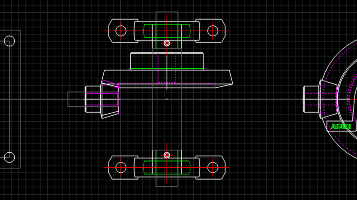 設計は部品のモーターのネジ穴やべべルギヤの形状をもとにautoCADで製図しました。