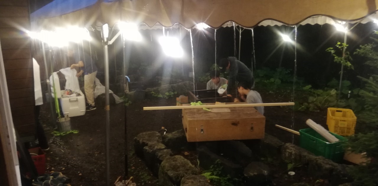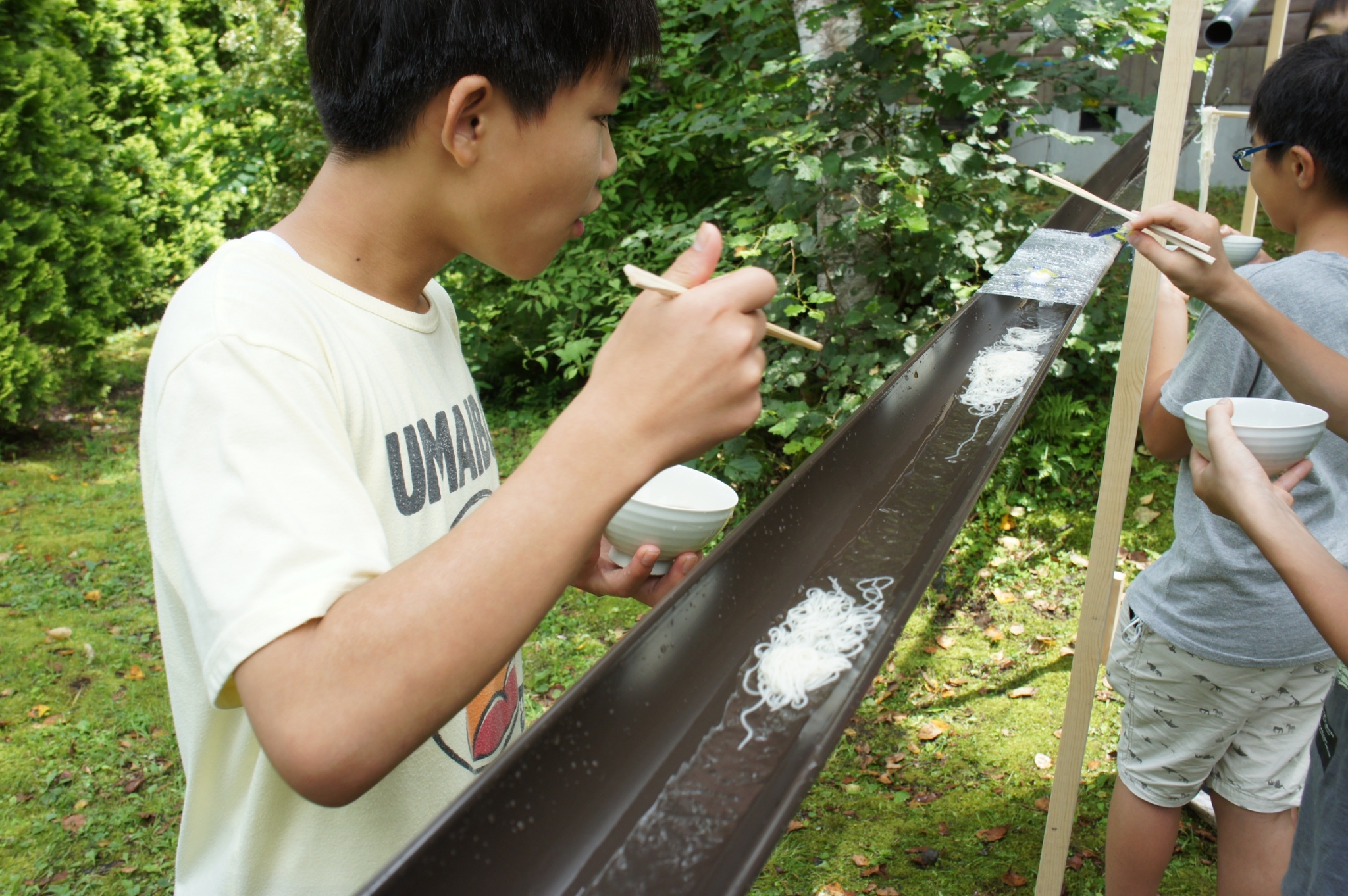 三日目の昼ご飯は今回の合宿の目玉企画でもある「流しそうめん」をおこないました 塩ビパイプと雨どいを使用して組み上げました