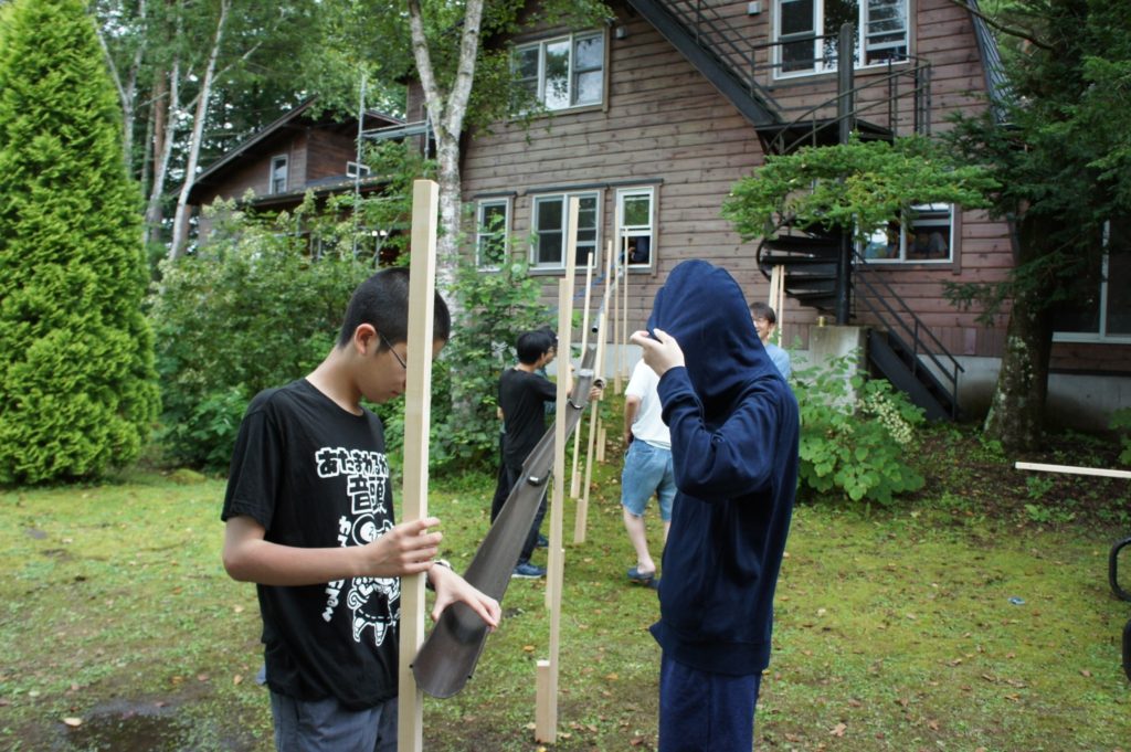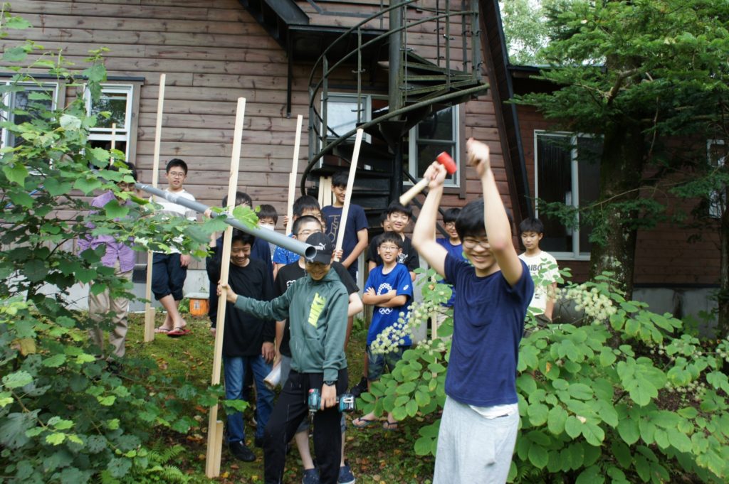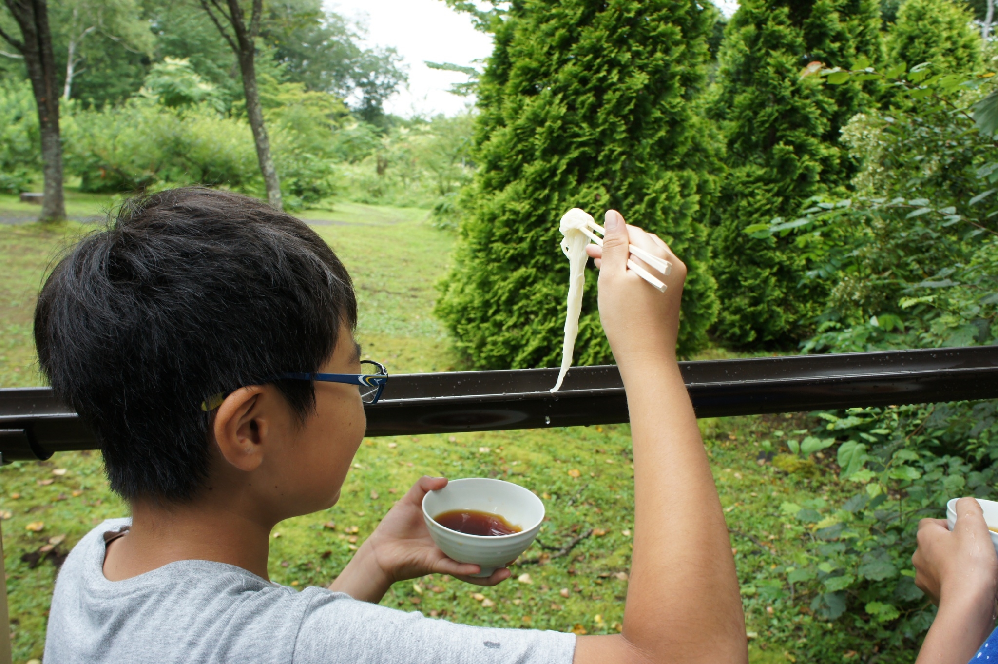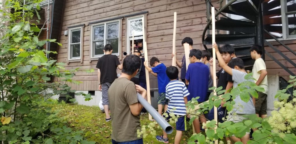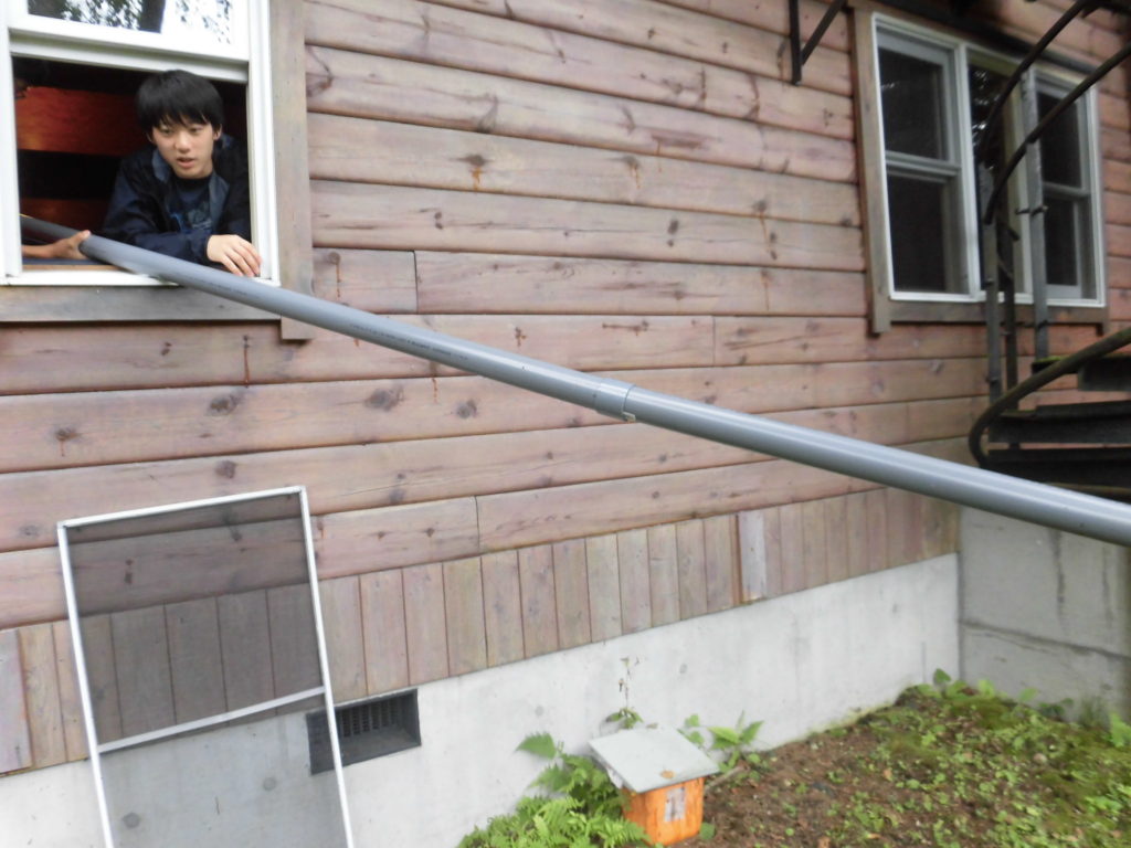 三日目の昼ご飯は今回の合宿の目玉企画でもある「流しそうめん」をおこないました 塩ビパイプと雨どいを使用して組み上げました