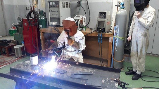 中3から溶接作業もできるようになるそうです。火花の上がる切断機を使っ