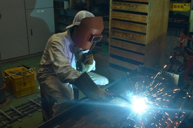 〇5インチ(127㎜)の幅の線路を高速切断機で切って溶接して鉄の角材から作り出します。