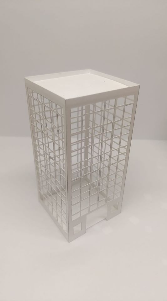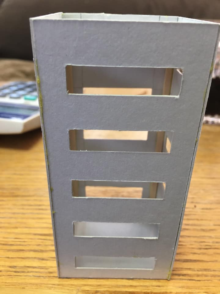 鉄道班の中学生向けに、Nゲージのジオラマの建物の模型の製作の講座を開いています。終業式の日に資材を配り、まずはカッターで紙を正確に切ることから始め、LINEやFacebookを使って先輩にアドバイスをもらいながら作っています。