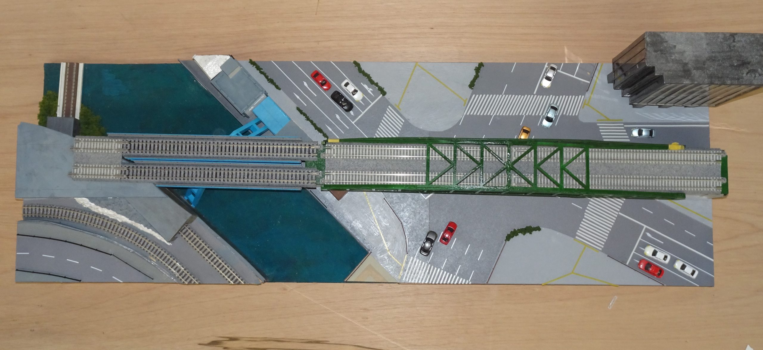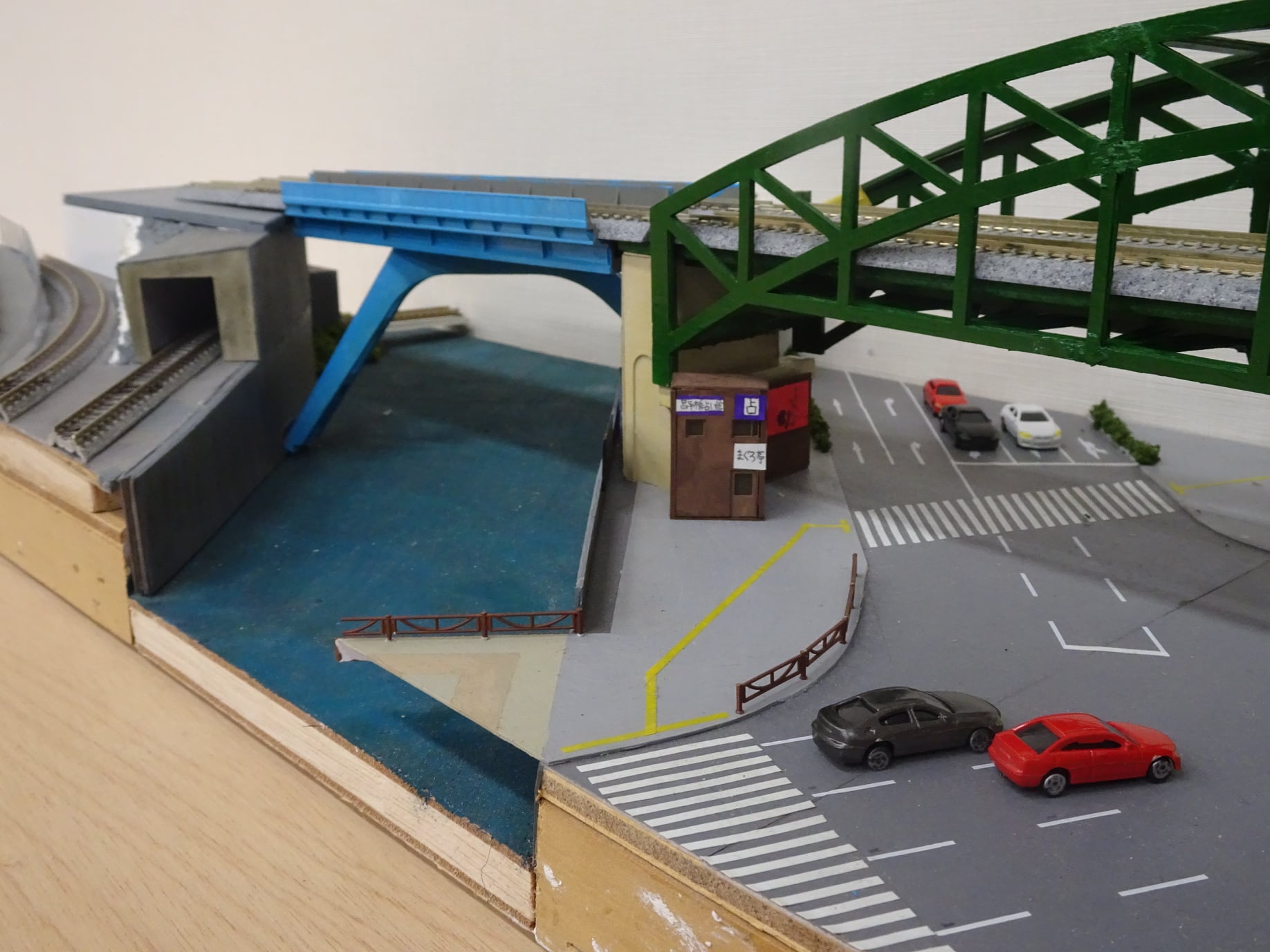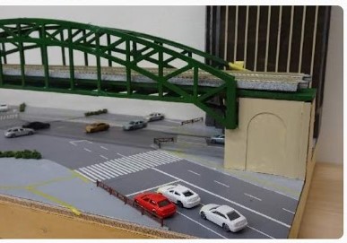 今回のポードで一番注目していただきたいのは松住町橋梁です。ボードの約半分ほどの大きさがあり、ボードのなかでかなり存在感があります。3Dデータとレーザー加工機を使用して細部まで実物にできるだけ近づけて作りました。現地に制作者全員で何度も行き観察したのでほとんど同じく作られていると思います。また、車を走らせることも考えて見た目を変えないようにしながら内部に木材を入れるなどして強度も持たせました。このように制作者が時間をかけ細部まで様々な工夫を凝らした作品になっています。