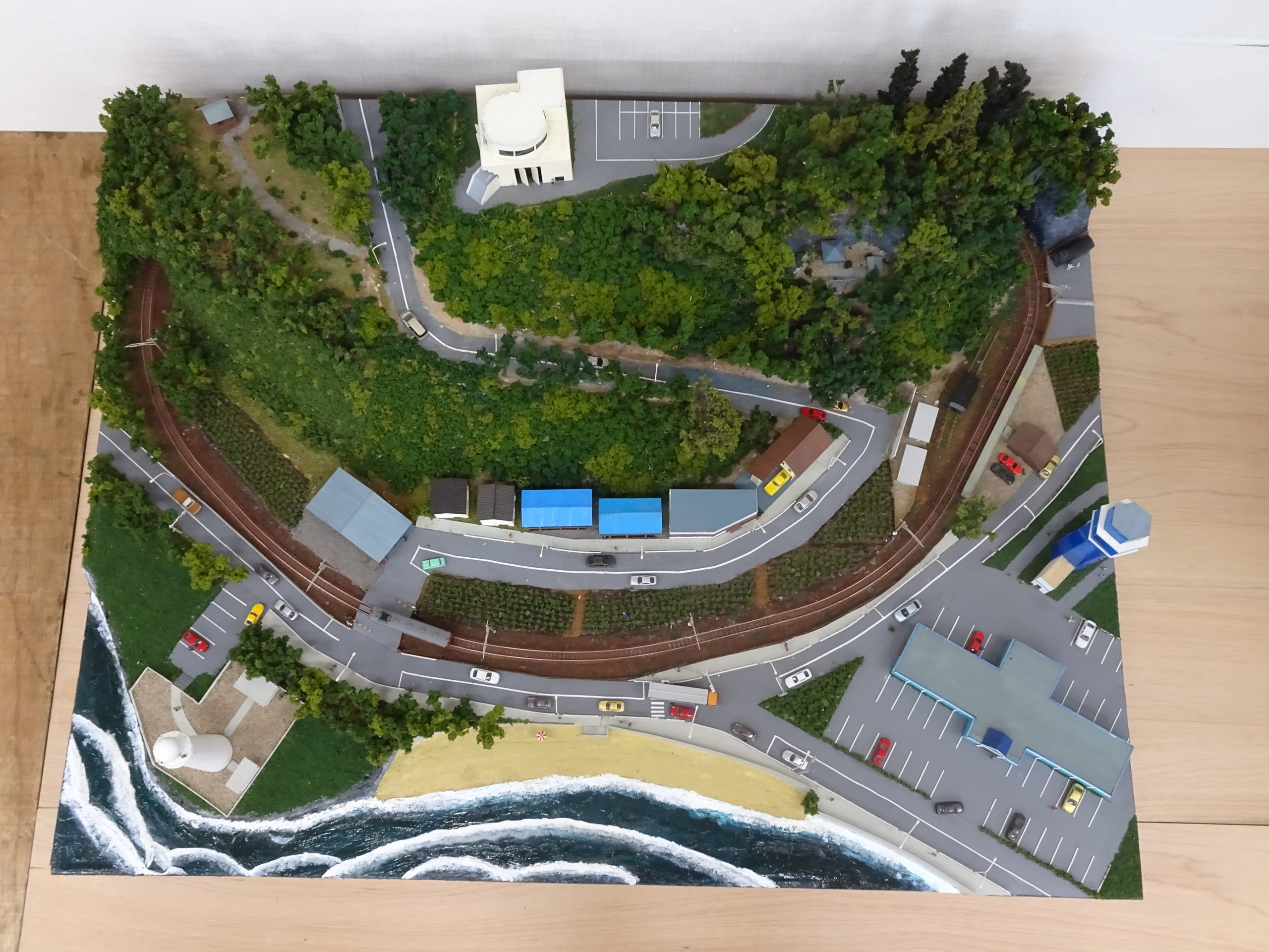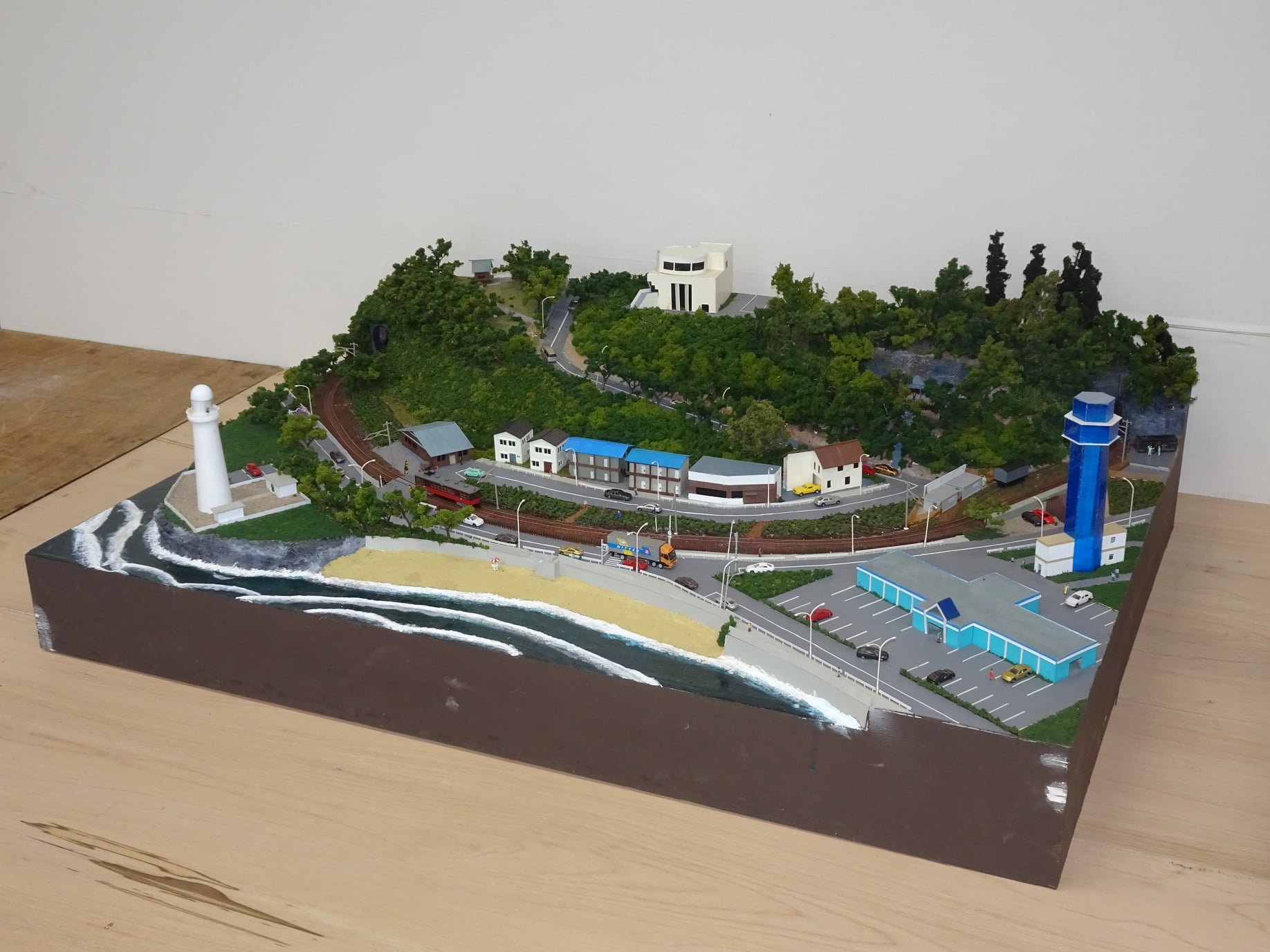 もう一つの苦労したことは丘の質感を表現するところに関して です。なぜなら、なかなか自然的な土にみえなかったので、ス ポイトと中性洗剤を使って何度も何度も絵の具を上塗りして土 の色を表現するなど時間がかかり苦労しました。これらによ りことで、モジュールの生き生きさが増して、銚子の持つ自然 の魅力を表すことができました。