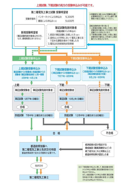 試験はマークシート式の四択で答えを選択する筆記試験と、 実際に工具を使って配線作業を行う技能試験があり、その両方に合格する必要があり、上期試験と下期試験の年に2回実施されます。