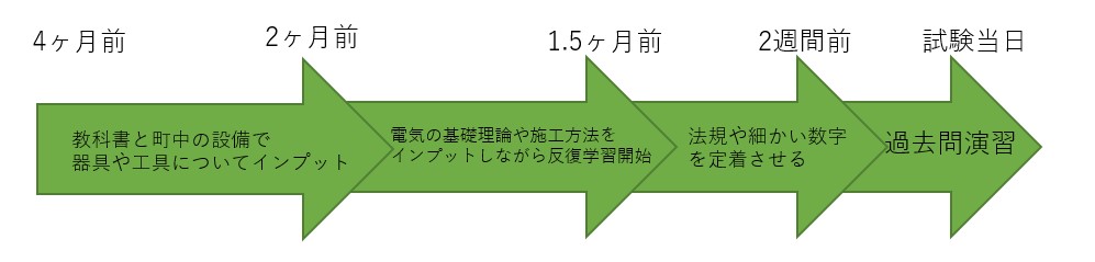 1.5ヶ月前ぐらいから法令や検査・難しい電気の計算などを学習し始めました。法令や検査などは出る問題が限られるので、過去問との反復学習で覚えたほうが効率的です。試験2週間前に上記の問題集を購入し、試験一週間前はひたすら問題をとき正答率を高めました。本番同様の50題過去問は試験2日前に腕試しで解いたところ8割ほど正答していたと思います。試験前日は、苦手だった分岐回路の設計・三相交流の結線という単元などをYou Tubeの解説動画などを見て集中的に補修し、前日までにほぼすべての範囲をインプットしました。