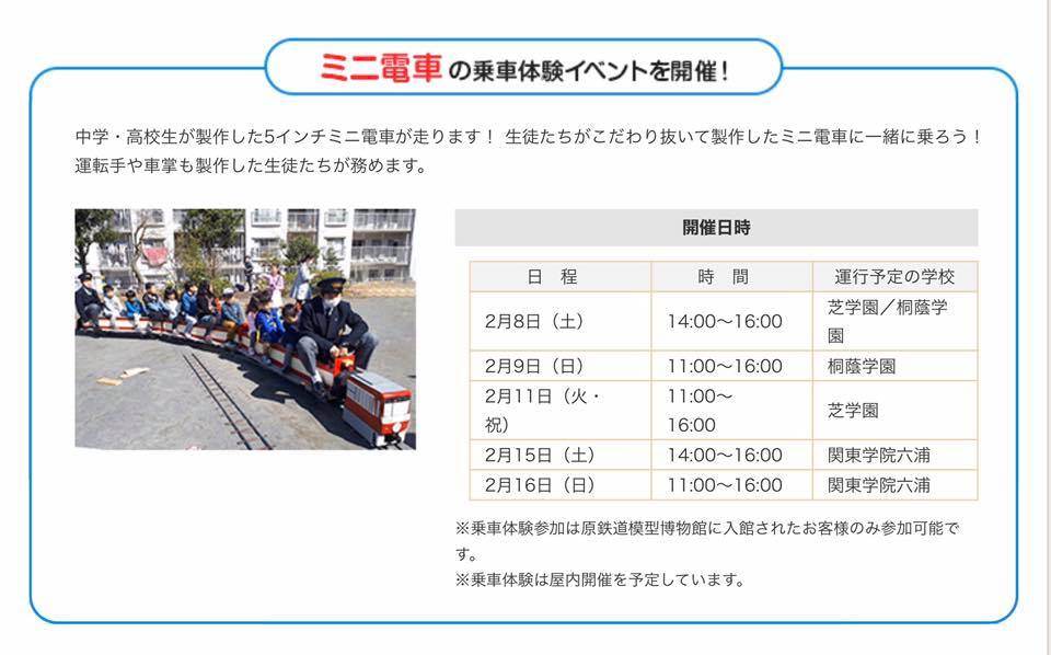 2020年2月に横浜にある原鉄道模型博物館にて、関東学院六浦中学校・高等学校さんと桐蔭学園中学校・高等学校さんと芝学園の3校合同で5インチゲージの乗車体験イベントを開催しました。