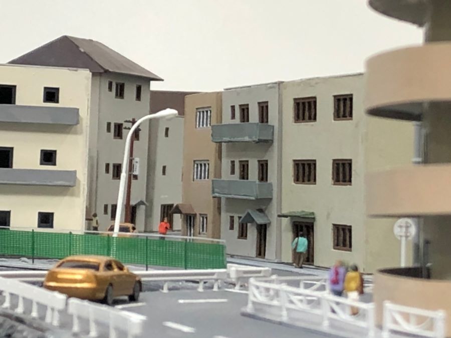 このボードは去年のモジュールボード作成でも使用したレーザー加工機を使用してほとんどの建物を作りました。レーザー加工機は㎜単位で極めて正確に紙などを切ることが出来るため非常にクオリティーの高い建物を作ることが出来ました。また、熱海駅側面の複雑な模様はパソコンで作ったデータを印刷して作りました。ボード内の木も針金・銅線をねじった物にターフと呼ばれる色付きの粉を付けることで高いクオリティーを実現しました。
