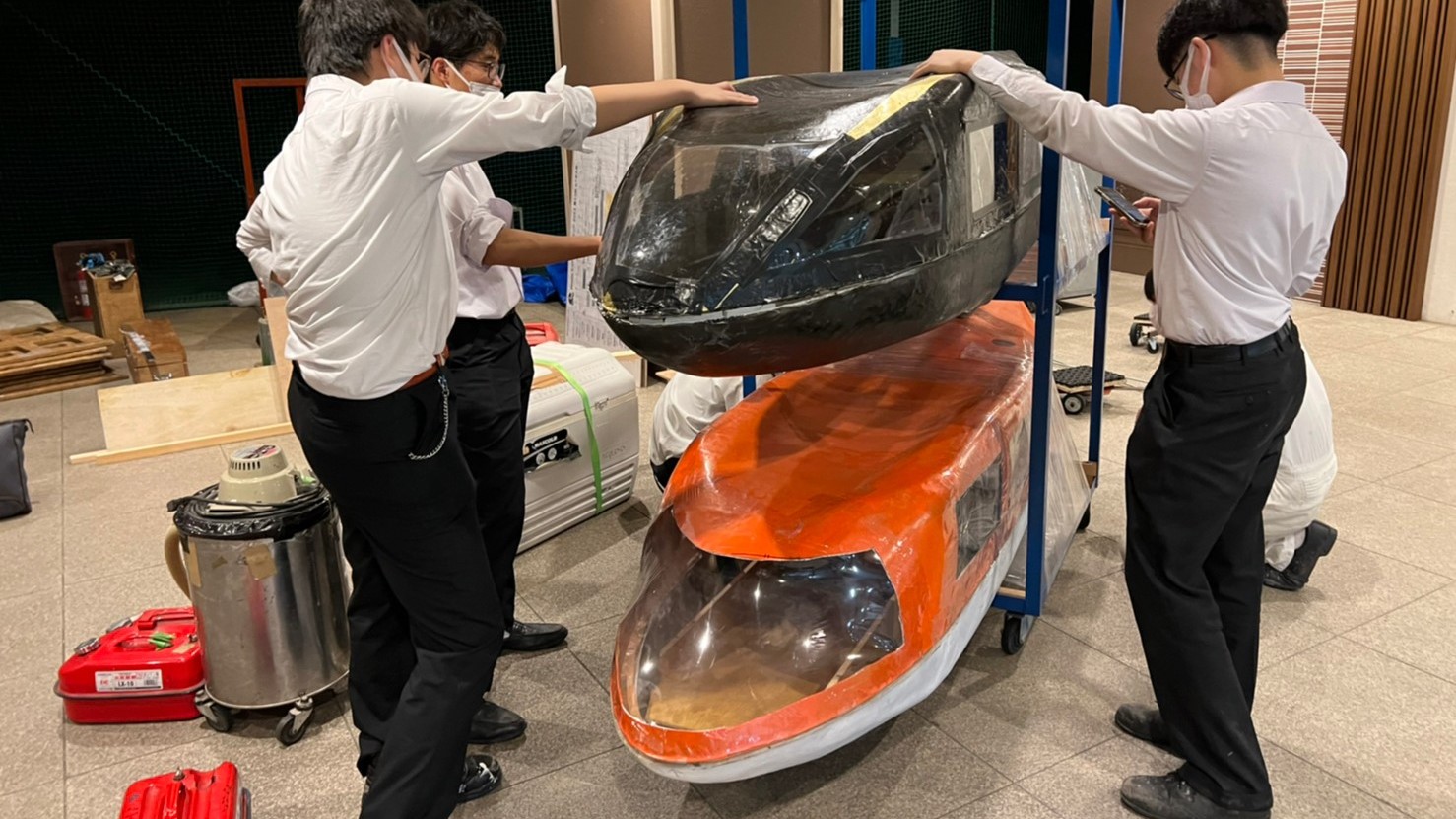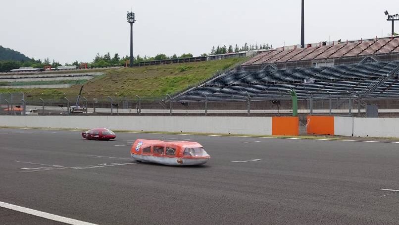 前日の夜に東京を出て、水戸で一泊して、当日の朝早くにモビリティリゾートもてぎに到着して大会への最終調整をしました。橙色の車両が中学生クラスの車両で、黒い車両が高校生クラスの車両です。