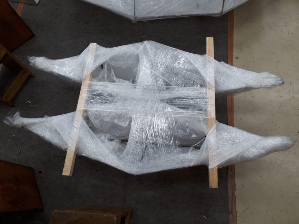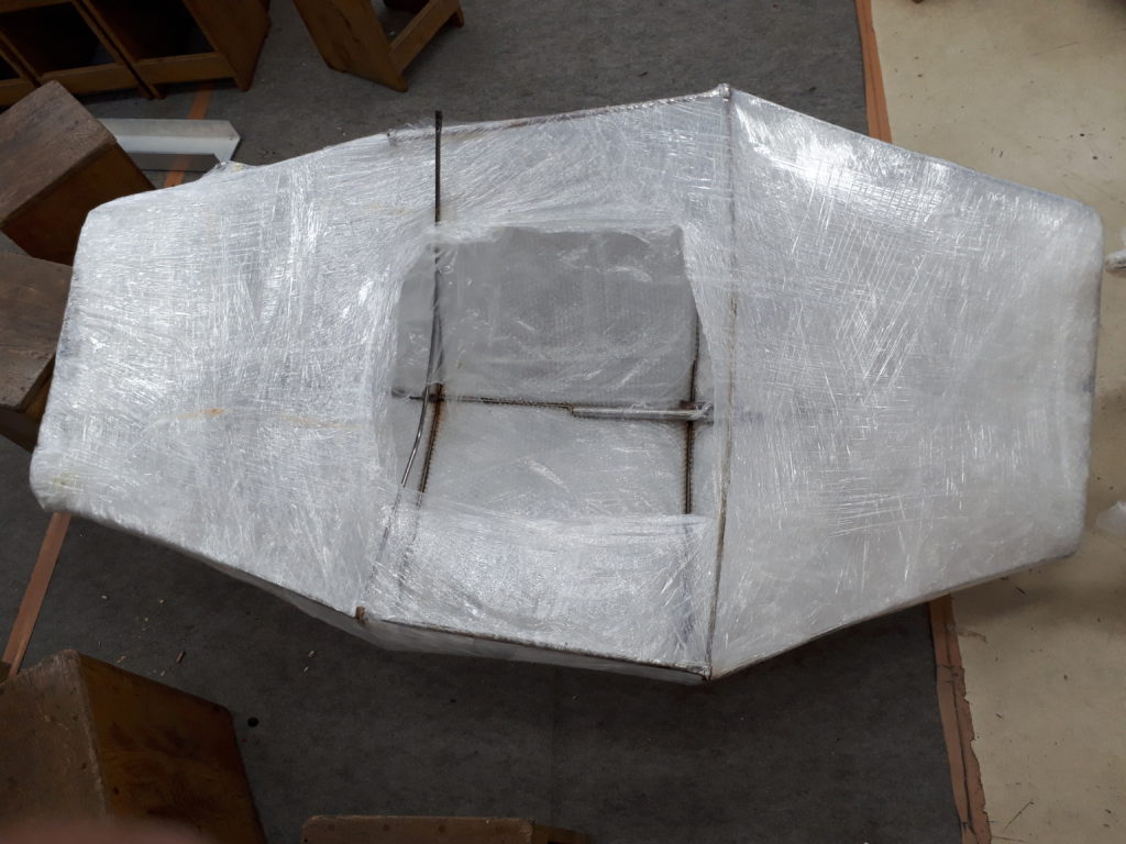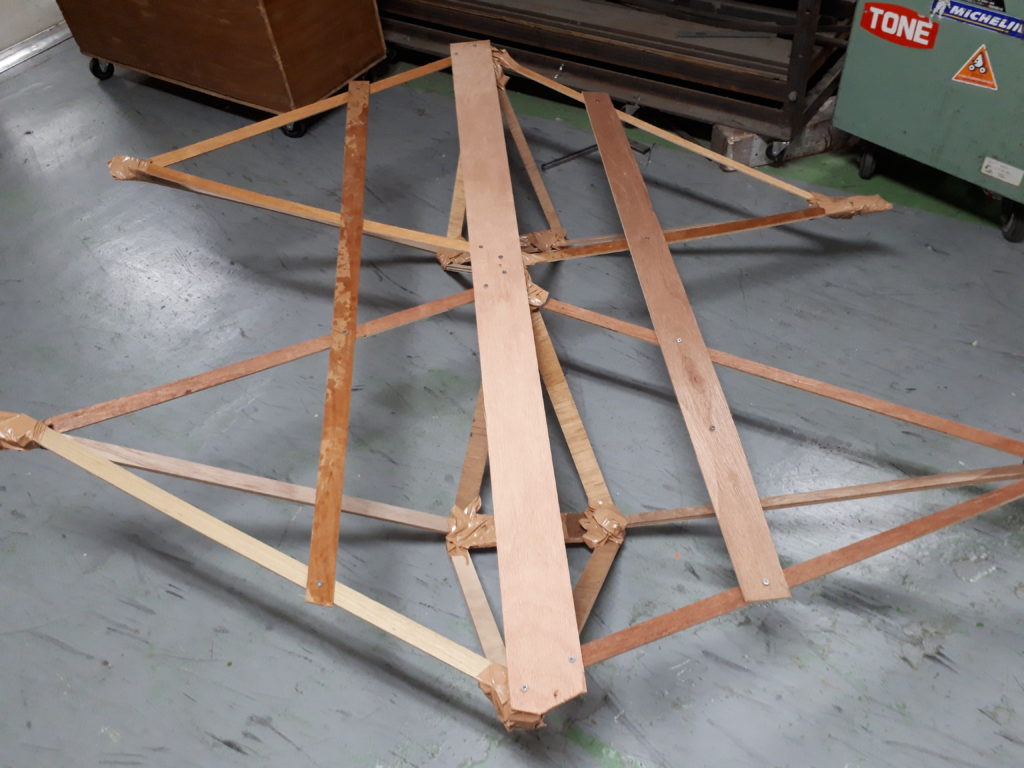 次は木材を使用して実寸大で製作します。こうすると強度が足りなくなる、排水量が足りない、などの問題点を明らかにすることが出来ます。実際に一艘目は高さが高すぎて乗ると顔を出せない、二艘目の双胴船にあっては排水量が足りない、という問題が明らかになりました。このような問題点を改善したものが以下の画像になります。