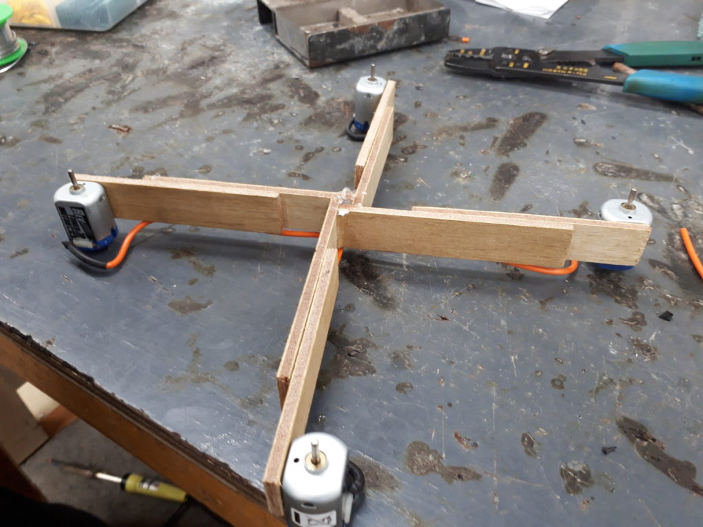 そして、ミニ四駆のモーターとプロペラをつけて簡単な本体をつくりました。